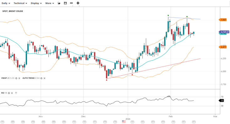 Brent Crude is holding its bullish breakout, though price action has become more range-bound. It continues to trade just above the VWAP of 6,742. With an RSI of 55, the uptrend is still valid, though the $70.00 level (7,007 on the chart) remains a formidable resistance zone.