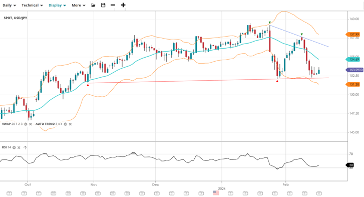 USD/JPY remains in a sideways trend but is showing increasing bearish momentum, with price now trading below the VWAP (154.69). The RSI has dropped to 38, signaling that selling pressure is rising. A test of the major support at 151.38 could be on the cards if the price cannot reclaim the VWAP.