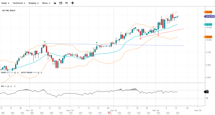 The UK 100 is currently the standout performer, trading in an impulsive phase near all-time highs. It is well above its VWAP (10,312), and the RSI of 62 indicates strong buying pressure. Resistance is now eyed at the 10,560 level, while support has moved up significantly to 10,063.