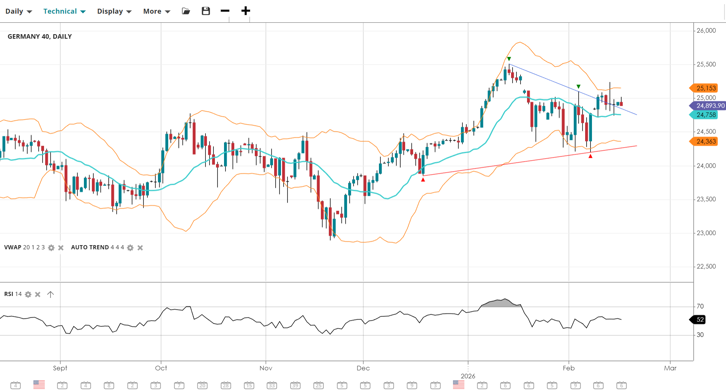 The Germany 40 continues to hover just below the 25k psychological level. It has successfully stayed above the VWAP of 24,758 following its recent correction. With the RSI sitting at 52, momentum is neutral-to-positive as the index looks for a catalyst to break toward the upper resistance band at 25,153.