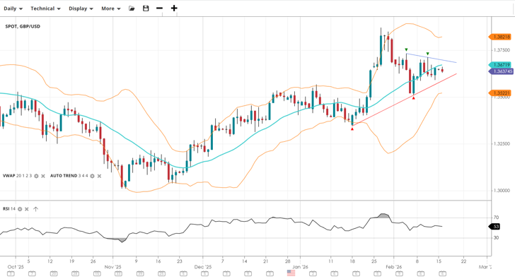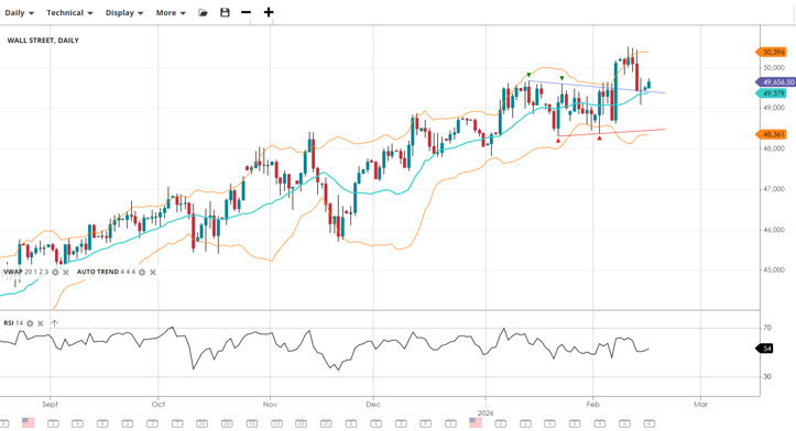 Gold has stabilised following the extreme volatility seen in early February. It is trading back above the 4,900 level and the VWAP (4,923). Momentum has recovered with the RSI at 53, suggesting the worst of the sell-off may be over, though resistance at 5,391 remains a significant hurdle.