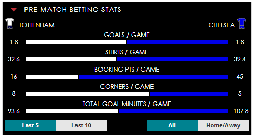 To see all the Tottenham v Chelsea betting stats and form, visit our pricing page to view our Pre-Match betting stats table or hover over/tap the chart image to see previous outcomes for that particular market.
